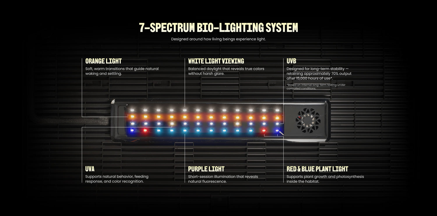 EKULLA’s UVB + UVA lighting provides professional-grade UV illumination, promoting the synthesis of vitamin D3, calcium absorption, and bone health for pets. Laboratory tests confirm effective UVB output for up to 15,000 hours (approximately 4 years of use)
